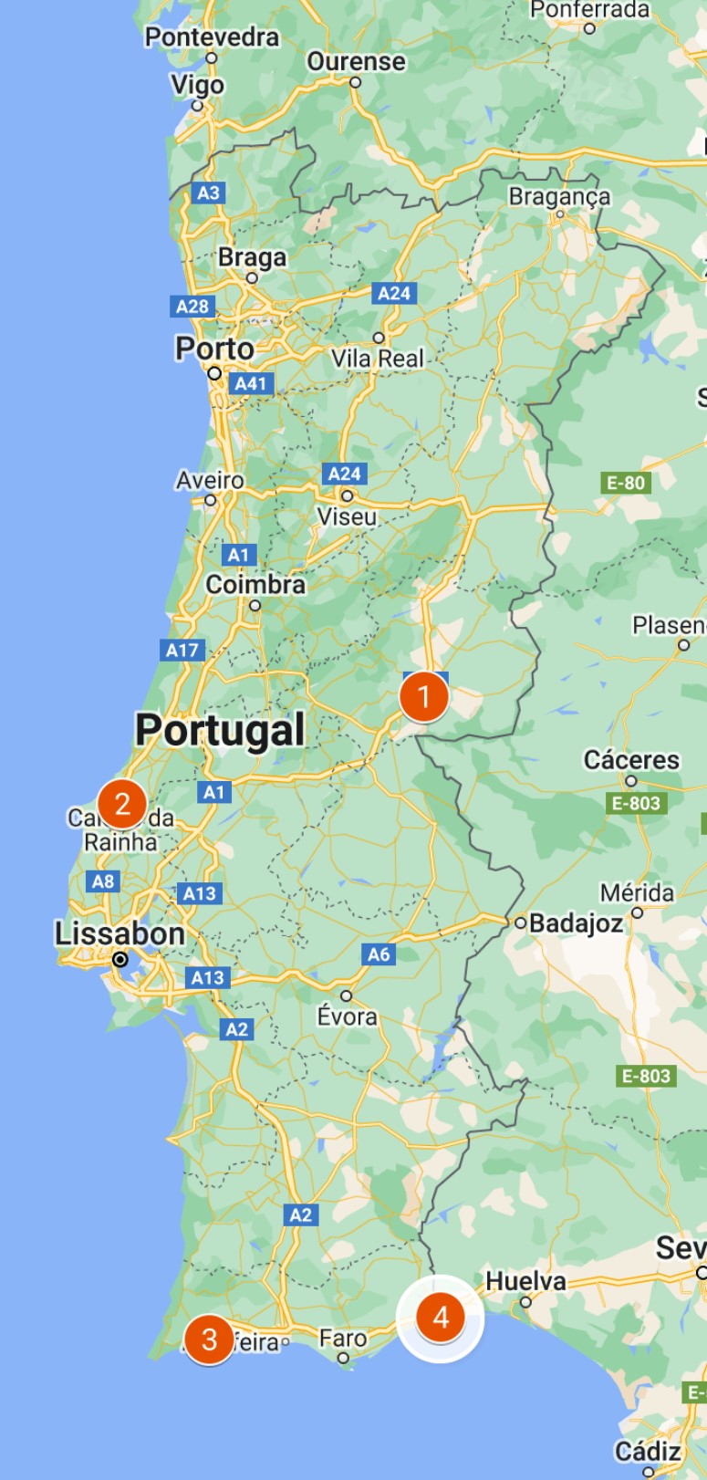 Portugal | Overzichtskaart plaatsen van de hotels/ klik op actieve kaart in Google Maps |