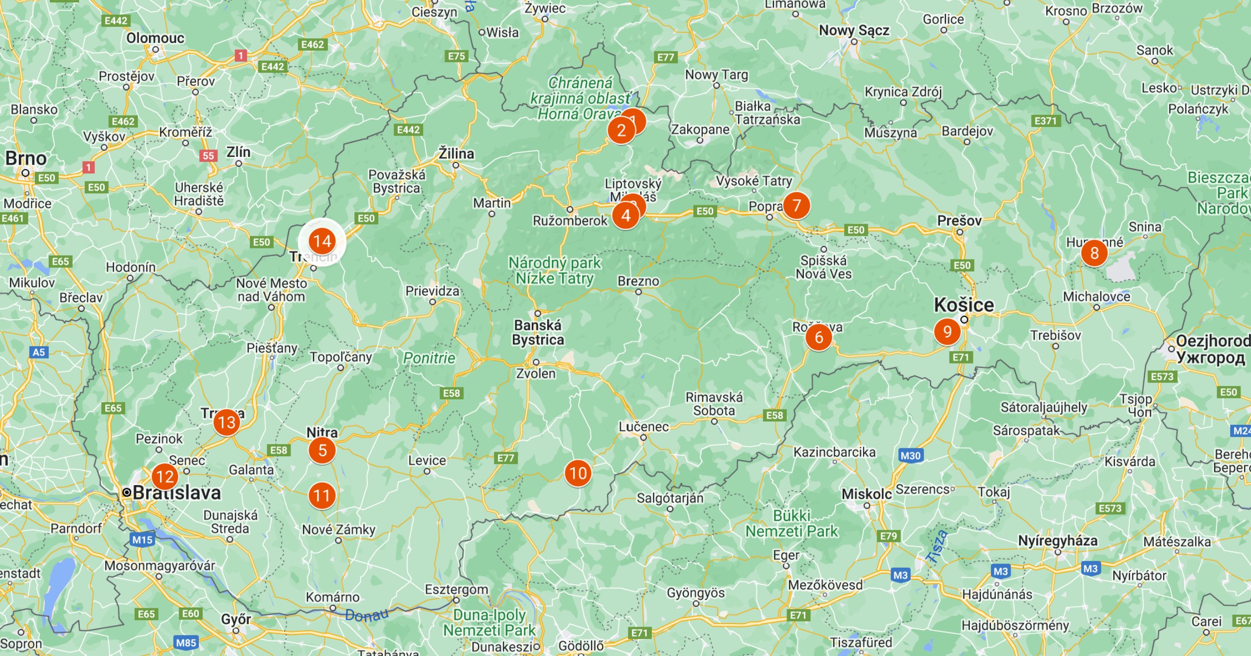 Slowakije/Slowakei/Slovakia | Overzichtskaart plaatsen van de hotels/ klik op actieve kaart in Google Maps |