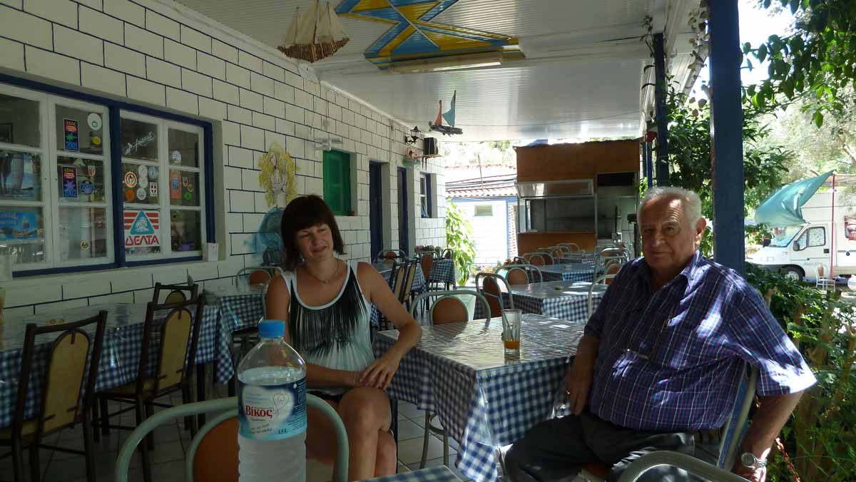 camping en staan op het punt te gaan eten in Taverna Panorama. Net als op Meganissi zullen ze wel erg ontdaan zijn over de gezondheidstoestand toestand van Els.