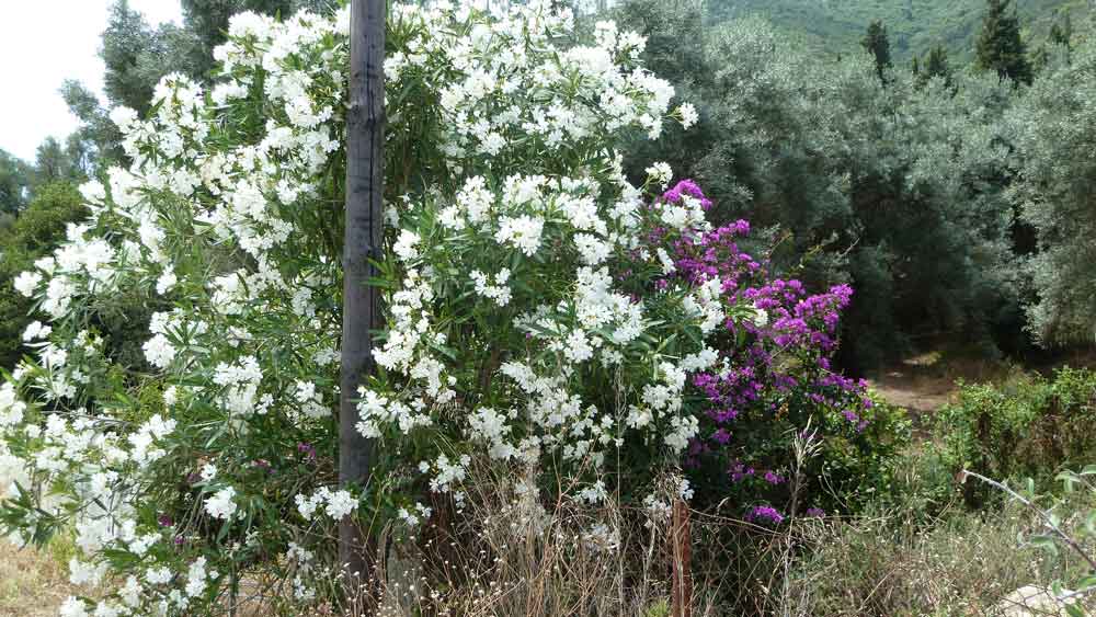 bloeien alle struiken langs de kant van de weg. Even voor 11 uur reden wij het eiland Lefkas op (lekas15019) en rond 11.30 uur Camping Dessimi Beach waar wij werden begroet door