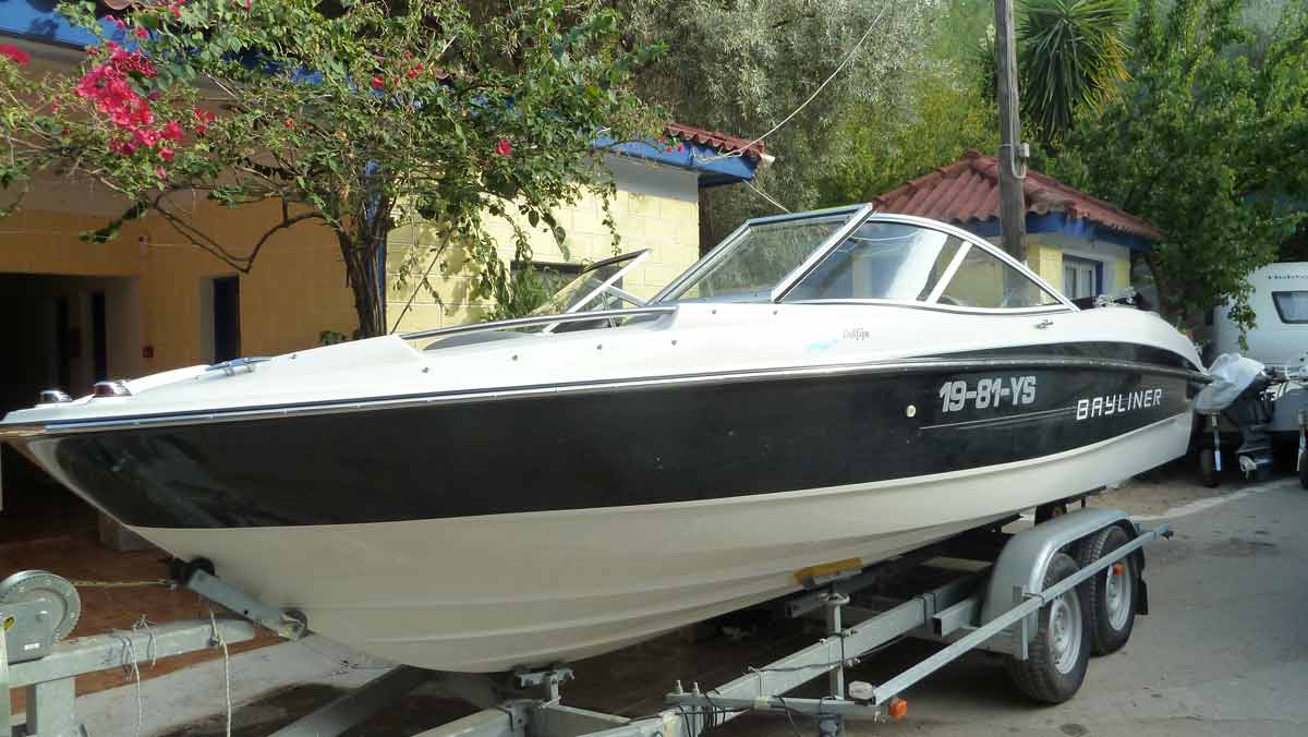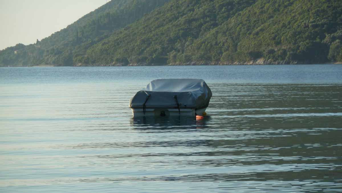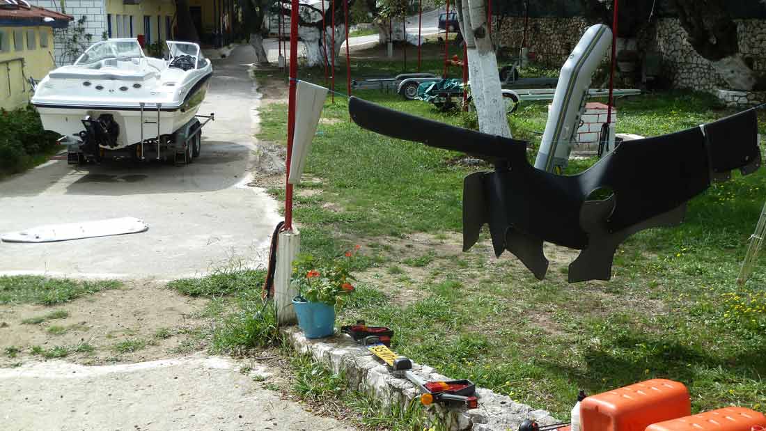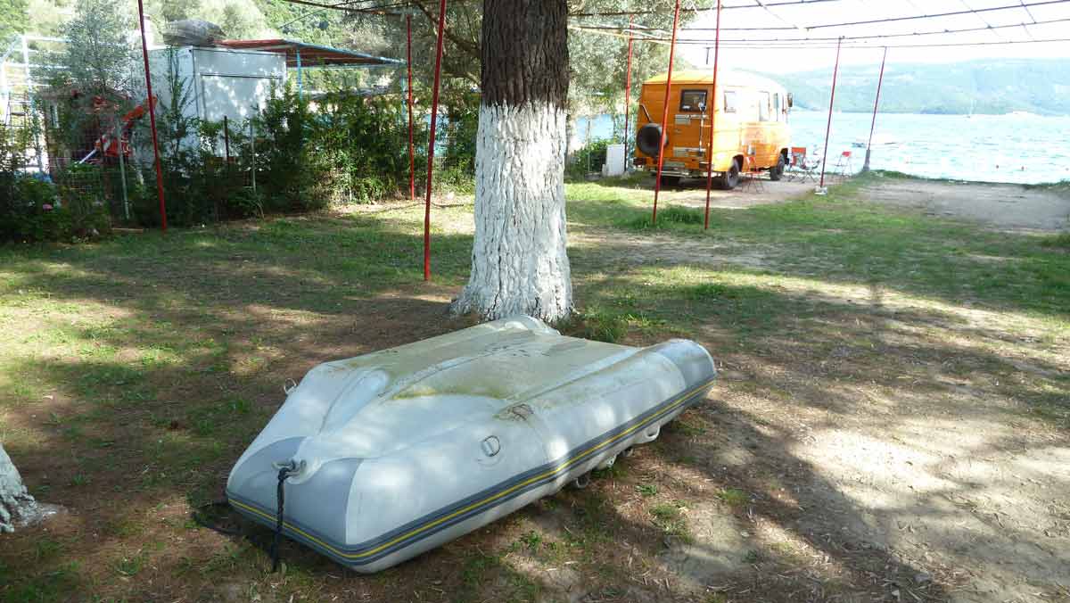 In de loop van de ochtend arriveerde onze boot, de HP7~Dolfijn, uit de winterstalling op de camping. Gelijk begonnen alles uit de boot te halen dat daarin gedurende de winter opgeslagen ligt (zomer 14040 & 14041). Daaronder ook de "tender", het kleine bootje dat ons van en naar de ankerplaats van de grote boot brengt. Even na 1 uur alles gereed om beide bootjes te water te laten. Na het oppompen van het kleine bootje stond een half uurtje later een van de luchtbuizen er een beetje triest bij (zomer 14042). Na enig speurwerk bleek de oorzaak een piep klein gaatje waardoor de buis leeg liep. Dat geplakt (zomer 14043) maar voordat er weer echte druk op gezet mag worden moet dat 24 uur drogen. Wij gaan ervan uit dat hier alles wat sneller droogt en zullen dus morgenochtend proberen het bootje weer op te pompen. Dan kunnen beide boten de zee in en gaan wij de ankerplaats van de grote boot in orde maken om vervolgens met de kleine boot weer naar het strand te varen en daarna, als er nog tijd voor is, een eerste bezoek aan Taverna Porto Spillia op Meganissi te brengen.