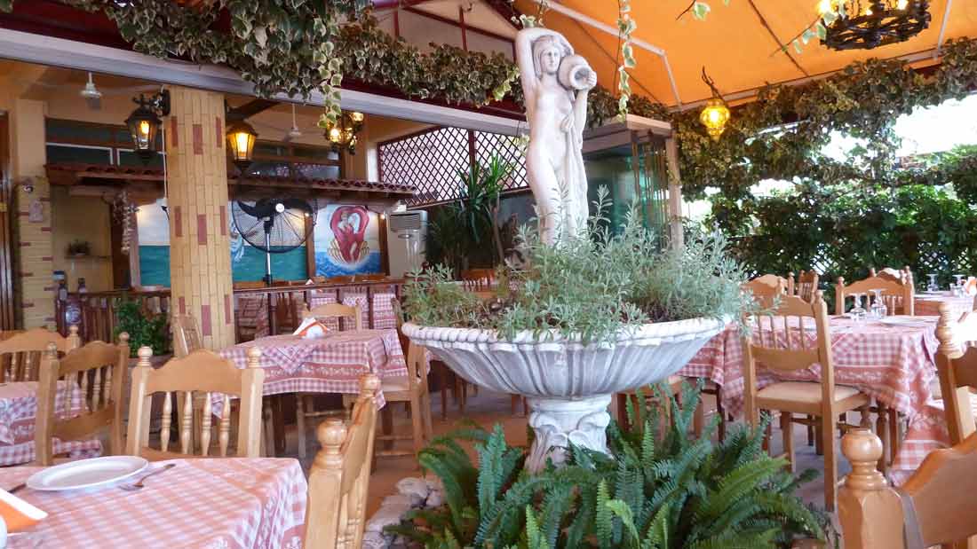 Lijnen van de boei in zee naar de boot, het achteranker uit en zo nog wat zaken. ben je al gauw een 1,5 uur mee bezig. Met altijd weer als gevolg, hoeveel "voorzonnen" in Nederland dan ook, weer aardig verbrand. Even na 12 uur gestart voor een tochtje, eerst een stukje langs de oostkust van Lefkas (zomer 14044) en een rondje om het eiland Meganissi met een tussenstop op een van onze vaste baaitjes (zomer 14045) en uiteraard de eerste stop in Taverna Porto Spilio, waar ons tafeltje met de ijsemmer al weer klaar stond voordat wij van de pier afwaren. Vanavond is hier op de camping een Greec Night dus wij gaan maar lekker in Nidri uit eten; deze keer naar de Panorama geweest (zomer 14046) waar de fontein helaas nog steeds in gebruik is als (onkruid)groenvoorziening (zomer 14047).