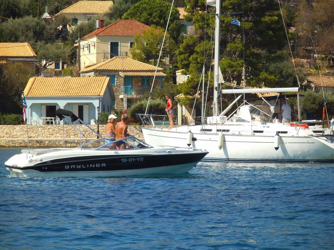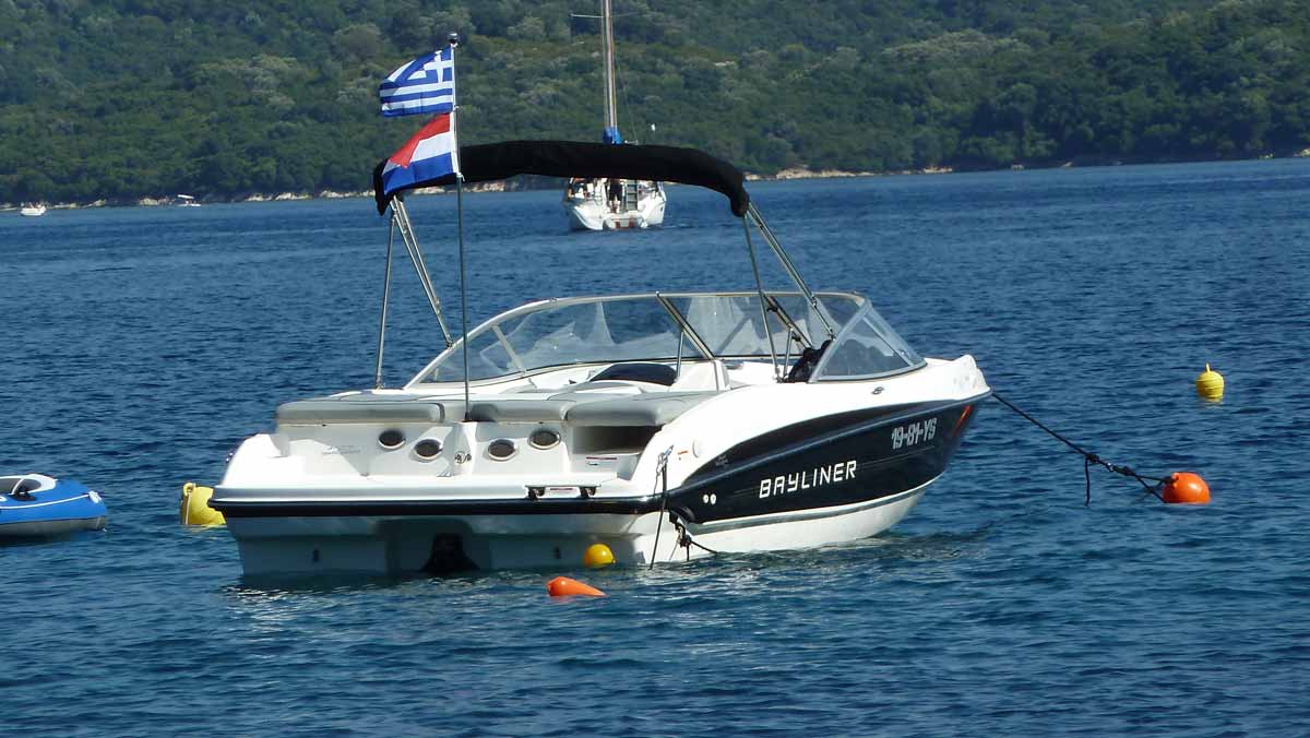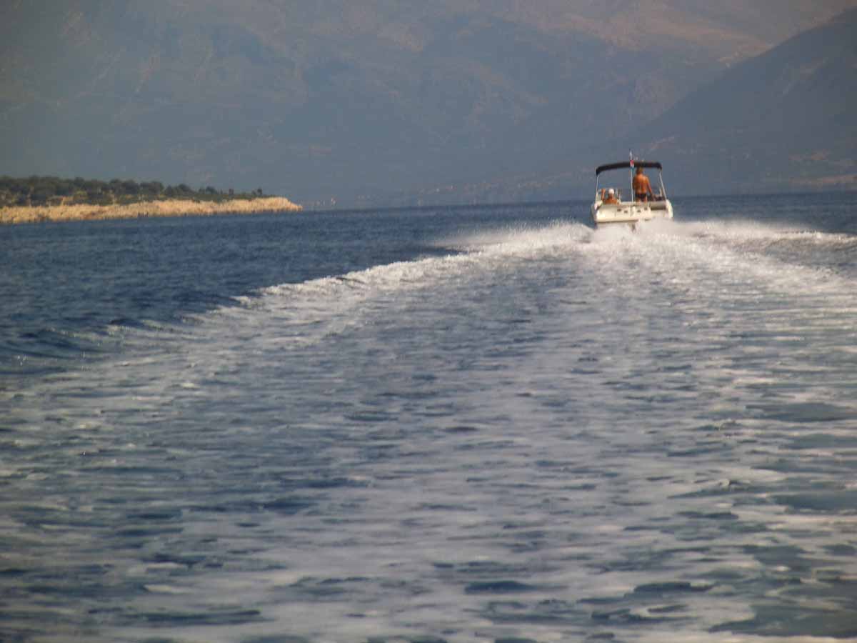 Vandaag een spontane rustdag. De grote boot gaf gisteren elke minuut twee piepsignalen af, teken dat er iets niet goed zou zitten, alhoewel dat verder uit geen enkele meter bleek. Dus vanochtend onze lokale bootheer laten bellen, die even later kwam. Bij inspectie bleek niets geks, maar voor de zekerheid heeft hij hij reservetankje met olie voor de staart iets verder bijgevuld. Motor tijdje laten lopen en geen piepsignalen meer. Bootheer naar de kant gebracht en weer terug om alsnog een stukje te gaan varen. Bij het starten, jawel, waren de piepsignalen weer terug. Elke minuut 2 hele harde, hoge piepen. Bootheer was net van de camping af en dus weer gebeld. Moest eerst volgende klus doen en zou in de loop van de middag terugkomen. Kwam rond 15.00 uur terug met de melding dat er niets aan de hand was en wij gewoon konden gaan varen (wordt je wel compleet gestoort van dat gekrijs elke minuut). Sensor is volgens hem stuk. Heeft nieuwe besteld in Athene; die komt met de buslijn (vervoeren dus naast mensen ook kleine pakketjes) Athene-Lefkas. Die bus komt vanavond rond 22.00 uur aan. Bootheer gaat dat ding dan morgenochtend in Lefkas-Stad ophalen bij het busstation en komt die dan daarna in onze boot plaatsen. Gelukkkig dat ze hier nog niet aan 300% weekend tarief doen ! Kosten een sensor die alleen senseert dat hij zelf stuk is € 120,-. Door al dat gedoe vandaag dus in de schaduw gebleven (was wel nodig ook) en alleen heen- en weer gevaren met de kleine HP, oftewel de tender (zom14048) en alleen op de grote boot (zomer 14049 en 14050) gezeten met de bootheer.