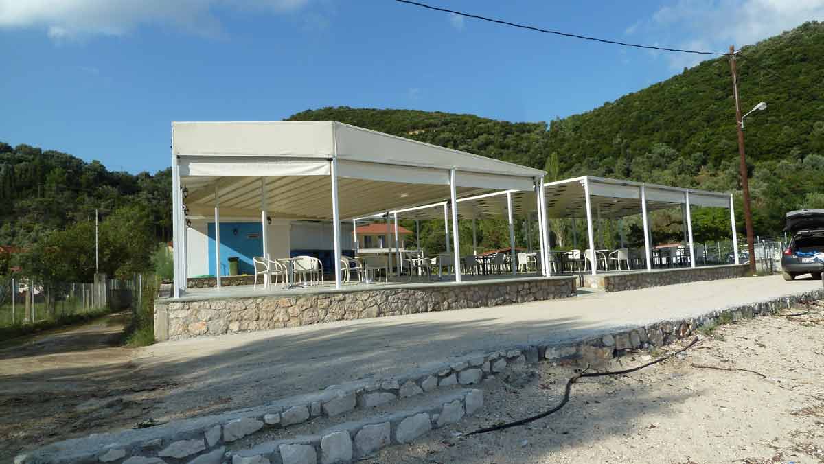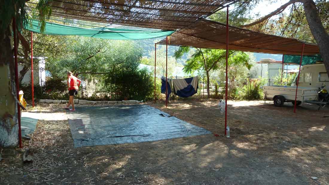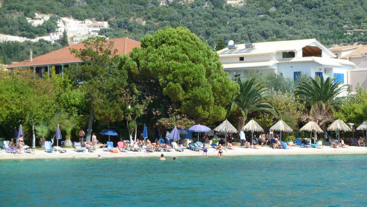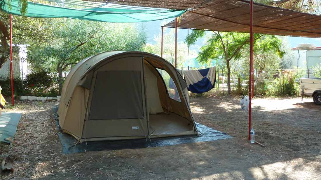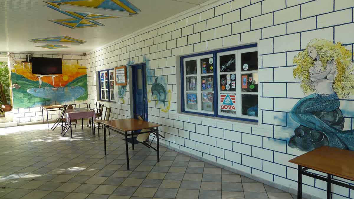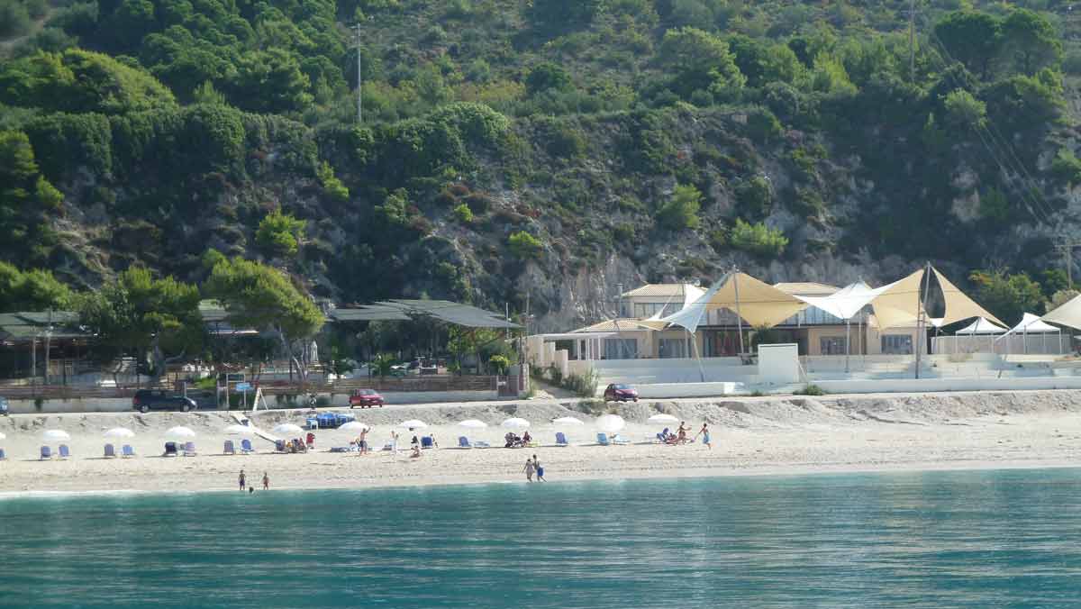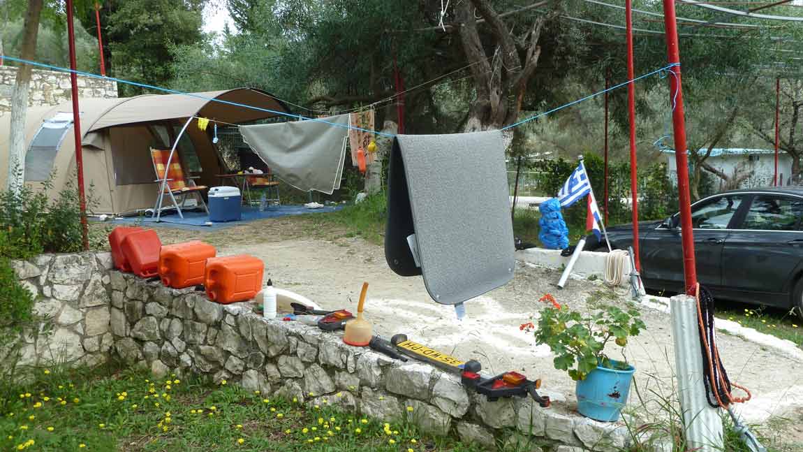 Today the final part of our trip, Camping Dessimi Beach, Lefkada. Wel left Hotel AAR around 9 o'clock and arrived at Dessimi Beach around noon. Had to wait to get a place to build our tent until 3 PM. Everything ready around 5 PM. Tonight we go to Nydri for dinner. Tomorrow, or perhaps the next day, our boat will be put in the sea. After that all the work is done and we can enjoy our stay overhere.