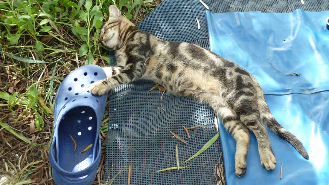This morning showing a very quiet and beautiful sunrise over Dessimi Bay. After breakfast, the son and daughter of our domestic cat had already installed themselves at our tent and we went to visit the beautiful Bay on the Mainland. The rest of the day exactly equal to yesterday.