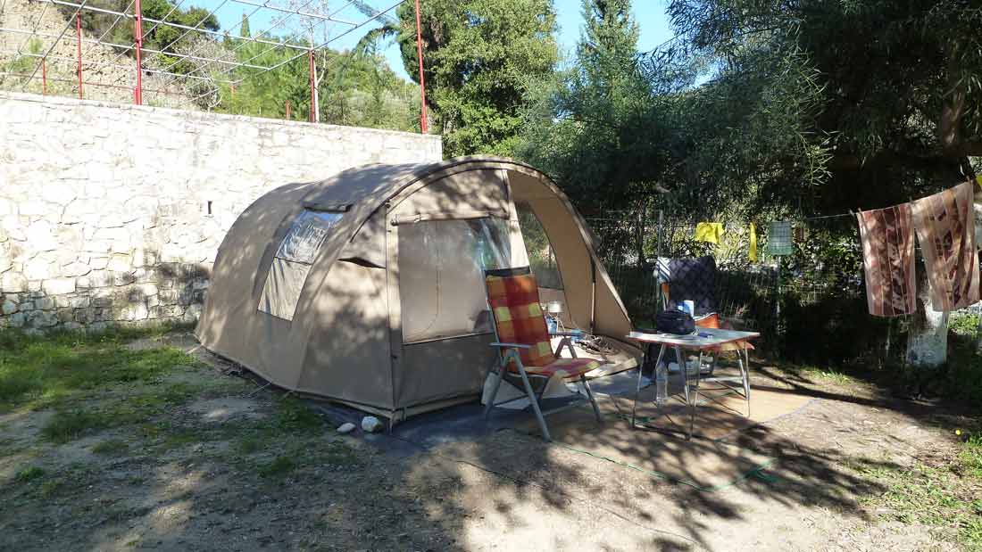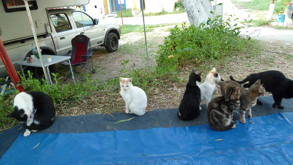 There are only 5 spots occupied on the campsite so cats from other parts of the camping also come along at our tent now, as this mother with child. Today we only went to the pebbeltjesbeach. Spent some time there and then, just like in the last days, went to Taverna Porto Spilia for a bottle of wine and back to the camp site where we started the first cleaning operations. Tonight in Nidri diner at Taverna Mamma Mia, which after Wednesday as the Panorama (spontaneous) closes, we will have to visit the next days. According to the weather forecast remains current weather for at least 2 weeks the same, so no stress about that. Departure is at the moment scheduled for next Sunday or Monday.