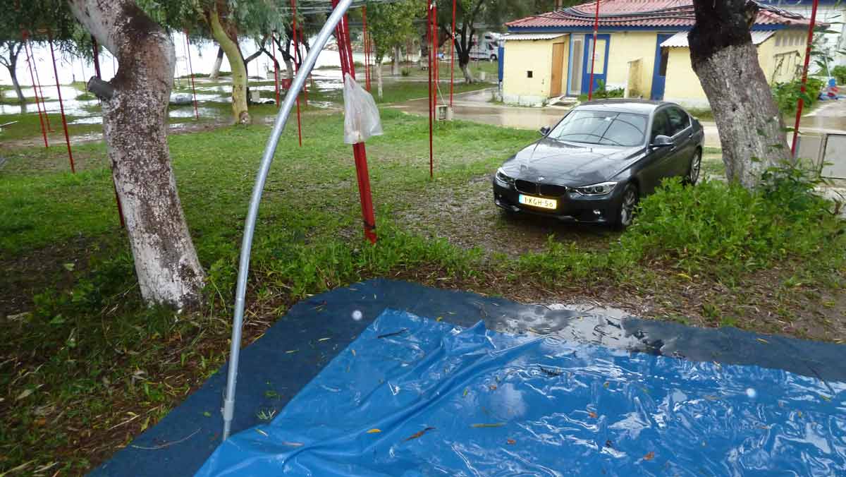 This morning after breakfast, all the stuff from the tent into the car and boat. Cockpit sail of the tent was very nasty at the bottom so had to clean it. Around 1.15 p.m. we were ready and after showering and say goodbye to the other 2 camping guests departed from Dessimi Beach. Via inner roads to Ioannina and from there along the highway to the North-East. Ended up in Hotel Maison in Chalkidona which we also visited on the outward journey . There are still a few rented rooms but very quiet compared to August; the bar we have for ourselves. Tomorrow to Serbia.