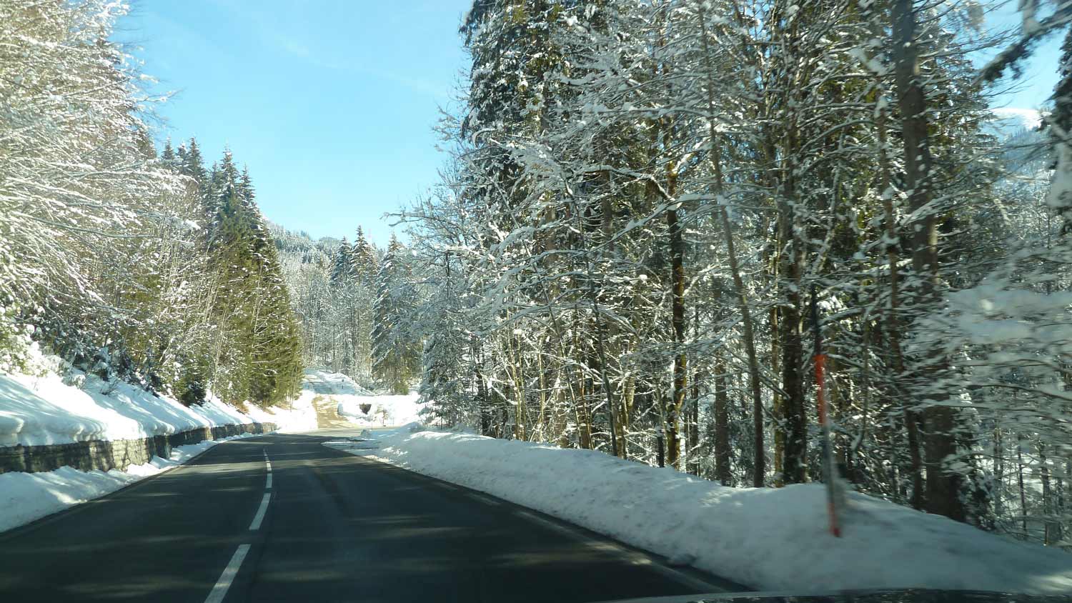 de Pyhrnpas (febr16011). Tot de grens van Kärnten steeds in de zon gereden. In Kärnten nam de bewolking snel toe en het laatste stuk dwarrelde er zelfs wat sneeuwvlokjes