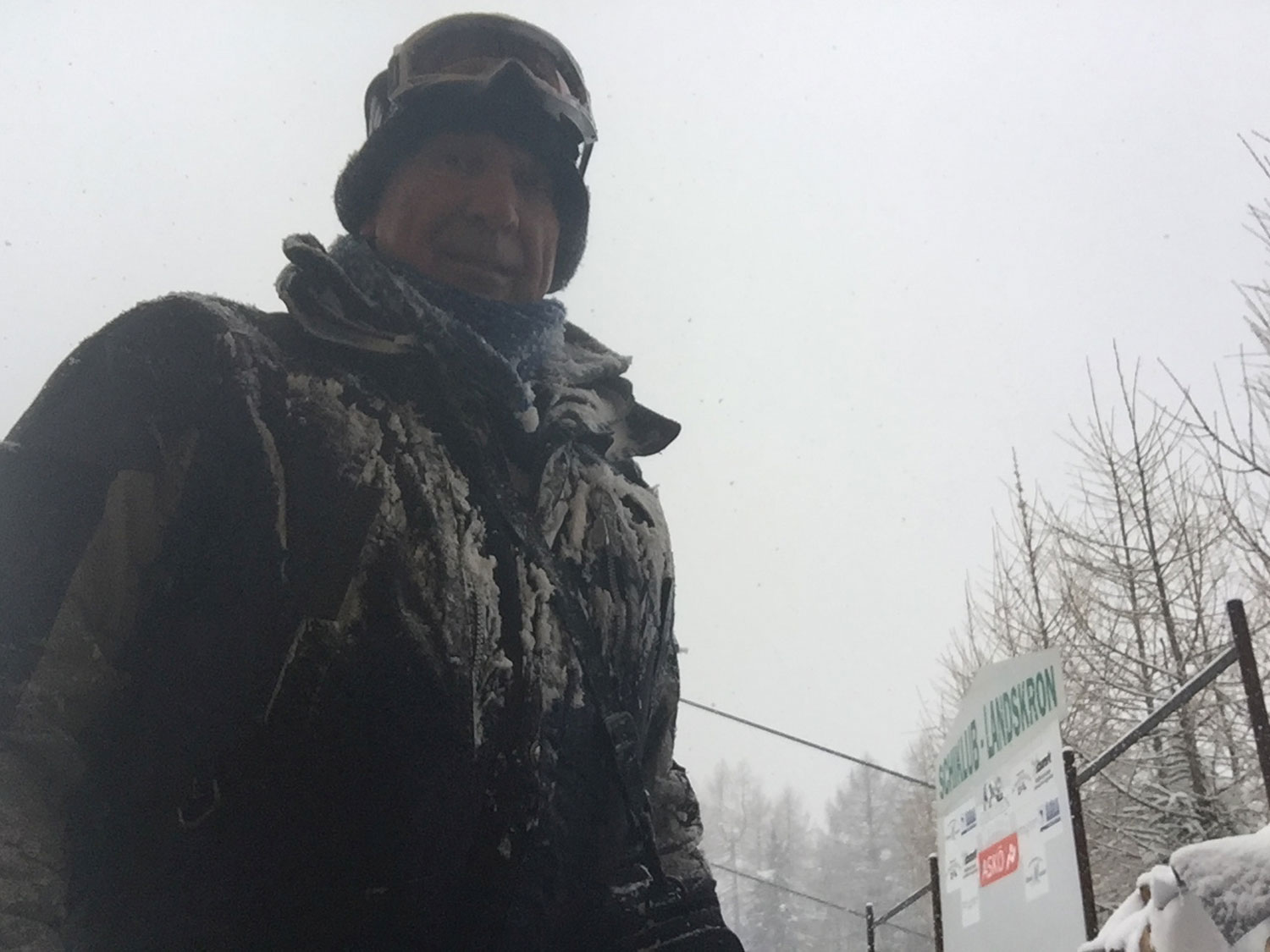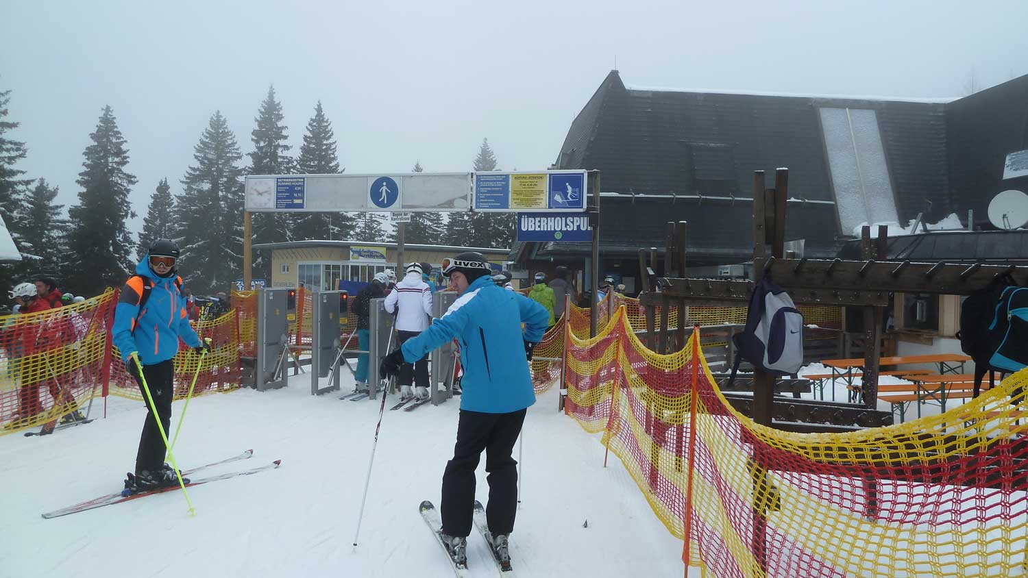 Vervolgens naar Klösterleliften gereden. Zwaar bewolkt en eenmaal op de bergtop aangekomen hing er een behoorlijke mist (wolk) en sneeuwde het zachtjes. Pistes waren nu wel