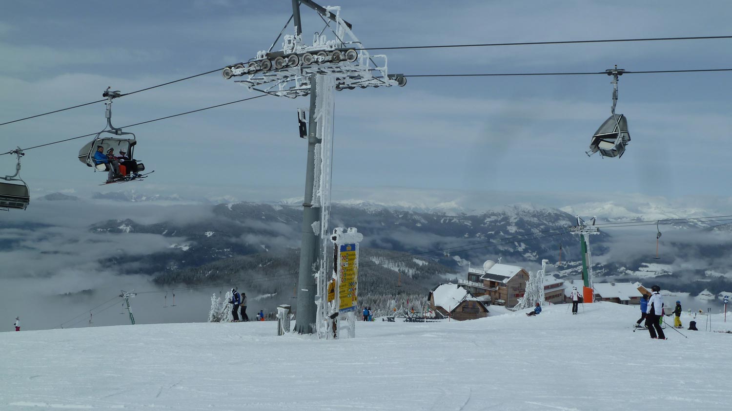 Vanochtend in Annenheim met de gondel de berg op. Drukte viel erg mee (febr16017). Zwaar bewolkt in het dal en boven de bergen. Er tussenin, op de pistes, vrijwel overal helder.