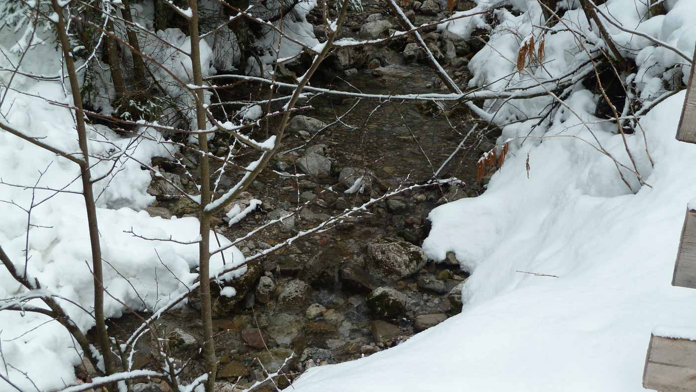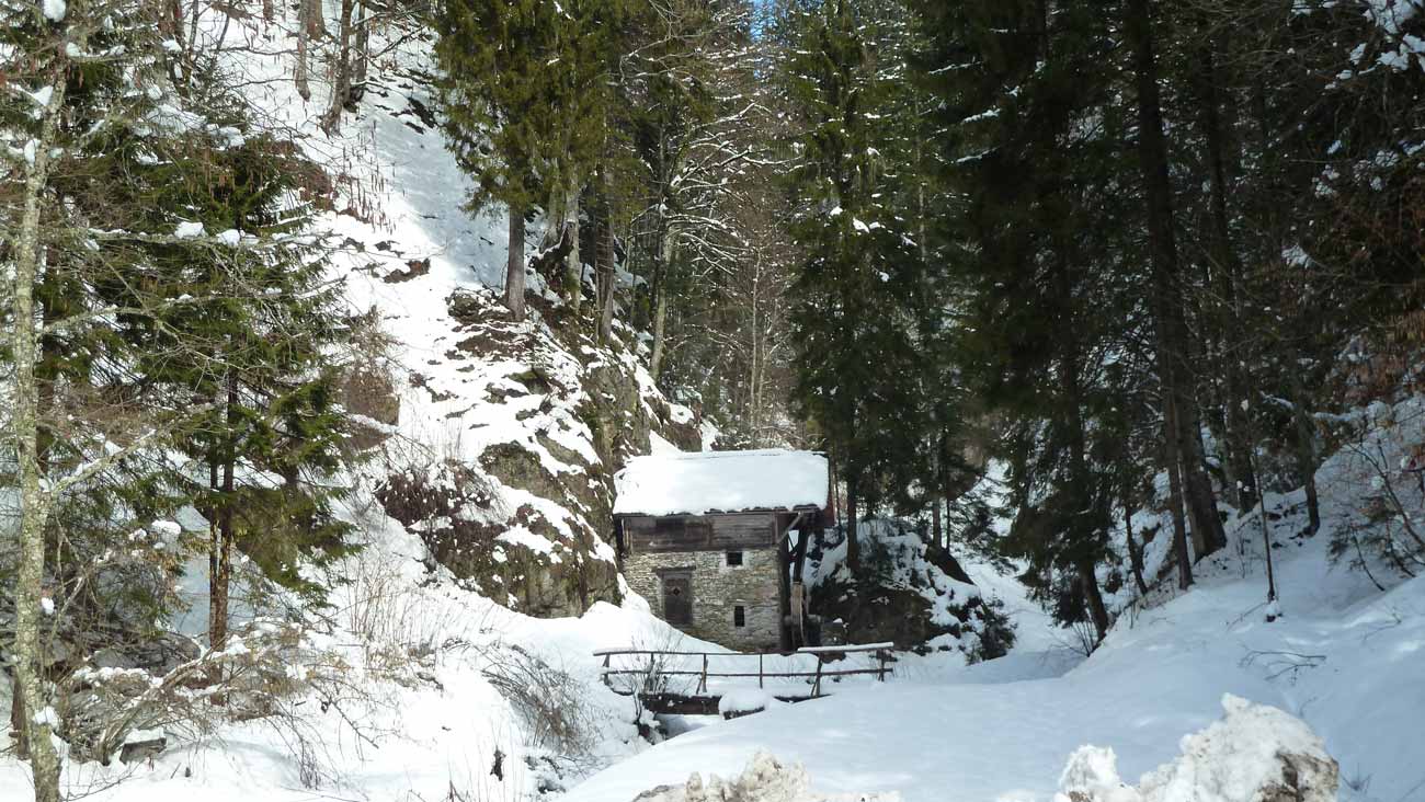 Zoals verwacht dichte mist (febr16059) op de hellingen. Na afscheid van de bemanning van de Neugartenstüberl met sneeuwval terug naar het dal (febr 16060).