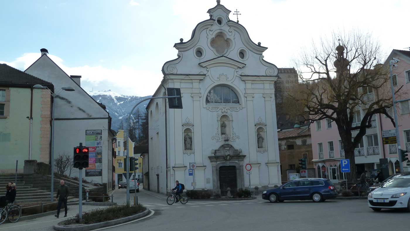 Bruneck. Geparkeerd net buiten het voetgangsgebied tegenover een kerk uit 1350 (febr16065). Aardig centrum met leuke winkelstraat (bijna alles dicht) en verschillende