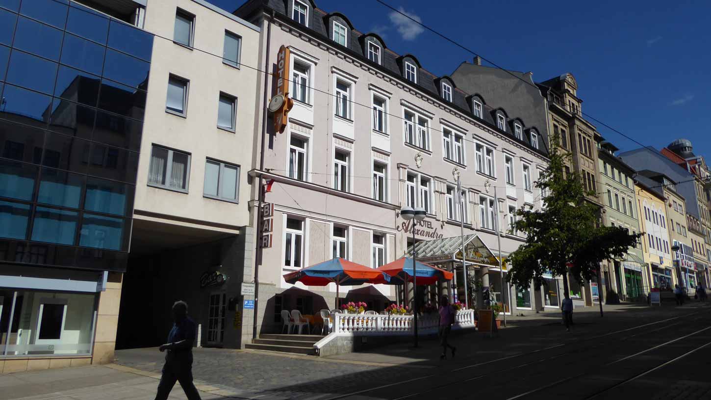 Gestern Abend gut gegessen im Restaurant (18111) dieses sehr klassischen Hotels (18112). Heute Morgen vom Hotel Alexandra (18113), endlich mit einem sch nen blauen Himmel, das "alte" Zentrum von Plauen besucht. Der erfolgreiche Aufstand gegen das DDR-Regime begann hier in Plauen am 7. Oktober 1989 (18114). Als die Grenzsoldaten sp ter niemanden mehr daran hinderten,