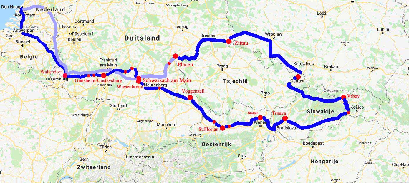 Donderdag 21 juni 2018: Gereden: 313 km Weer: vertrek uit Wallendorf half bewolkt 21 C, onderweg deel half bewolkt verder zonnig met 26 C