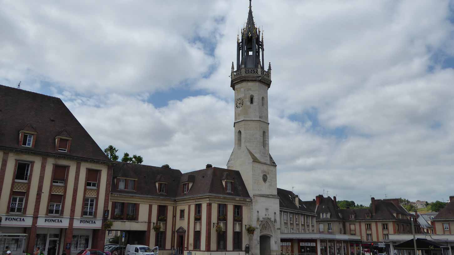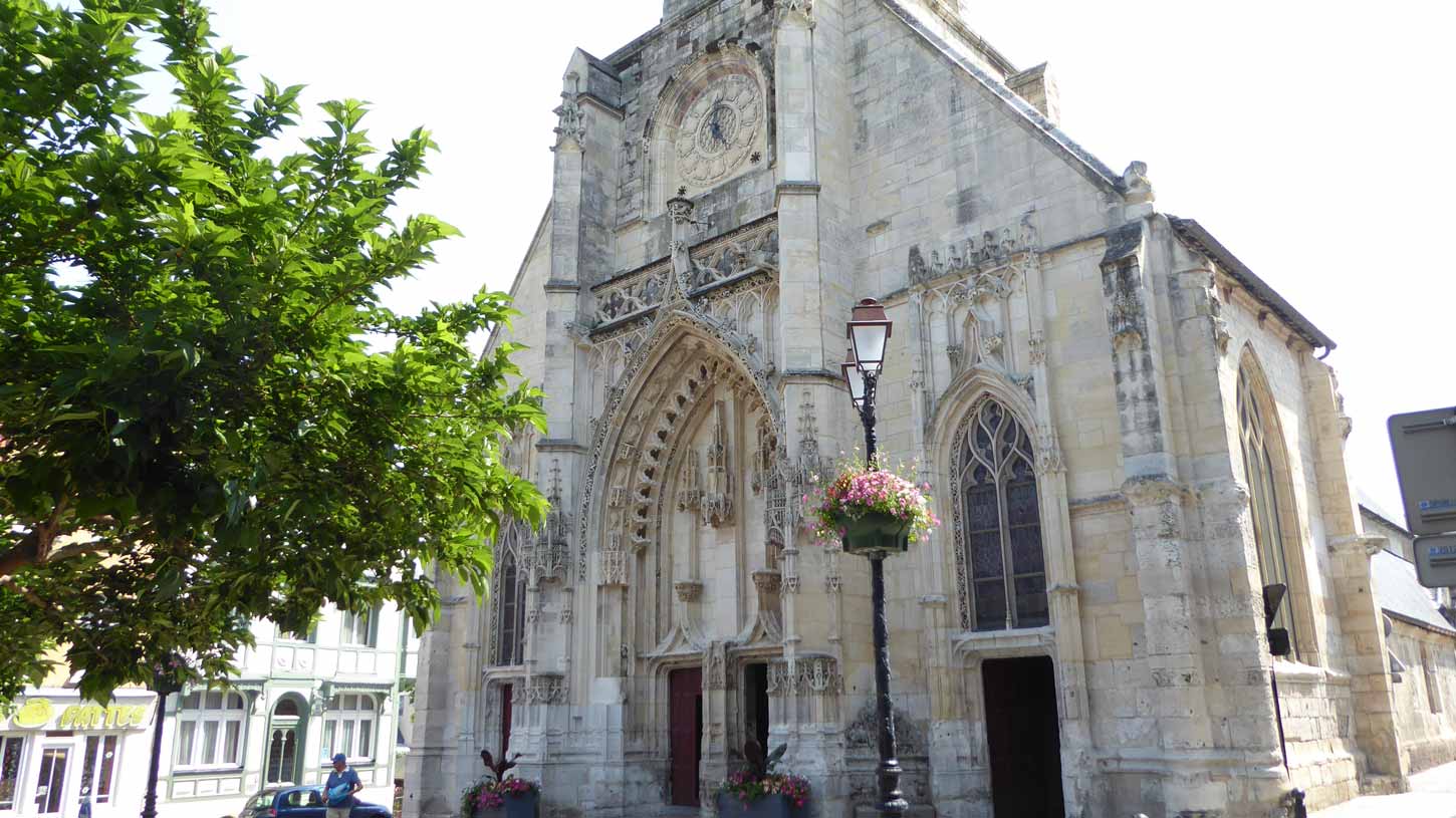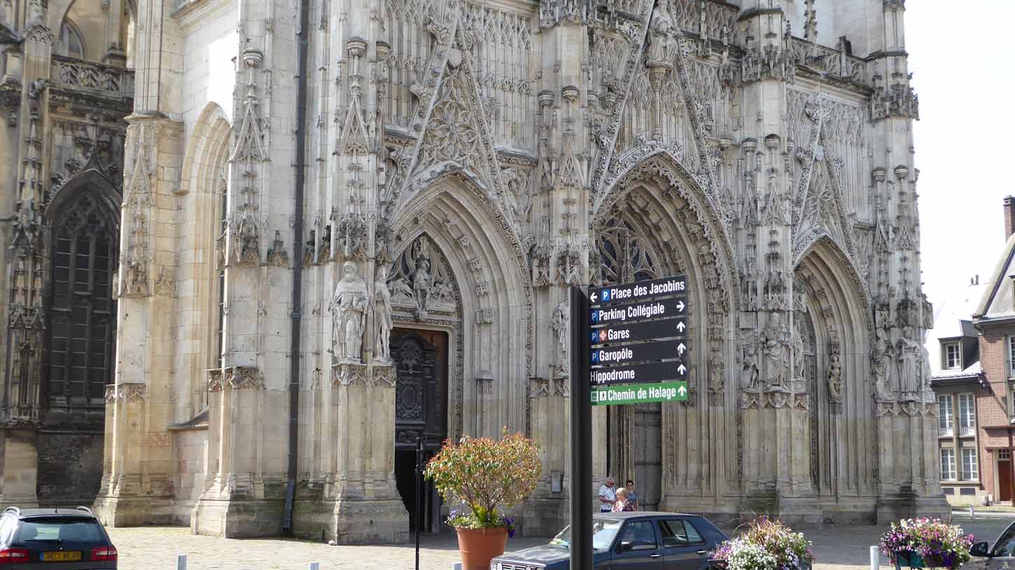 Abbeville gereden. Buiten de Sint-Wulframkerk, een kapittelkerk in flamboyante gotische stijl gebouwd tussen 1488 en 1539 (046 t/m 051) en de Belfort (klokkentoren)
