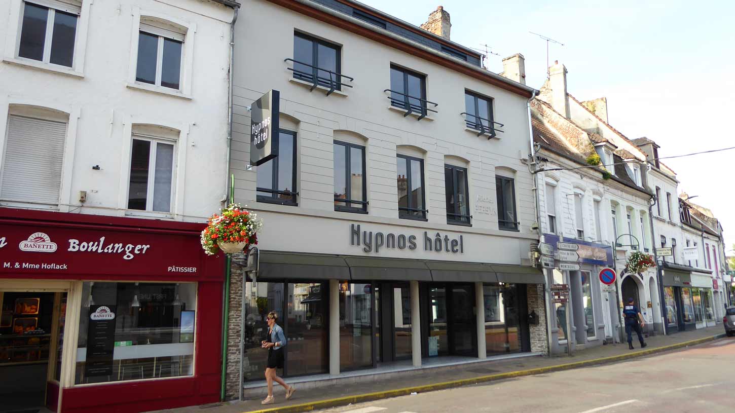 zum Hotel Hypnos in Hesdin. Heute Abend esse ich irgendwo anders weil das Hotel kein Restaurant hat; es hat eine Bar, aber es schlie t um 20.00 Uhr.