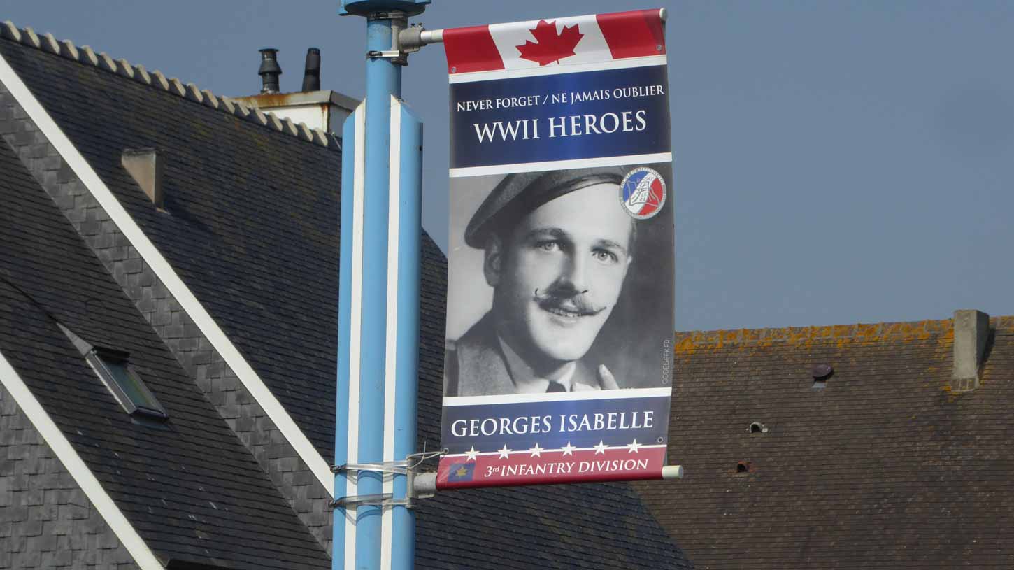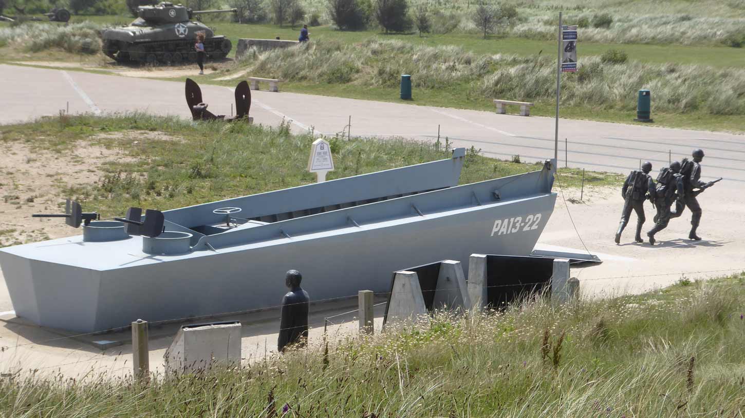 herdenkingsplekken zijn (080). Aan elke lantaarnpaal langs de gehele invasieroute hangt als eerbetoon een foto van een omgekomen soldaat (081). Aan het eind van Juno