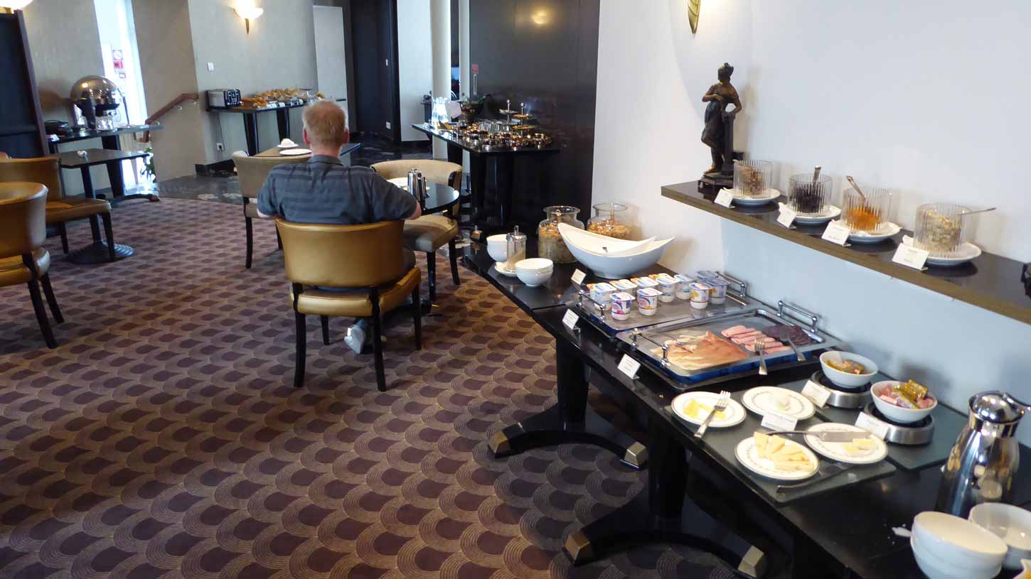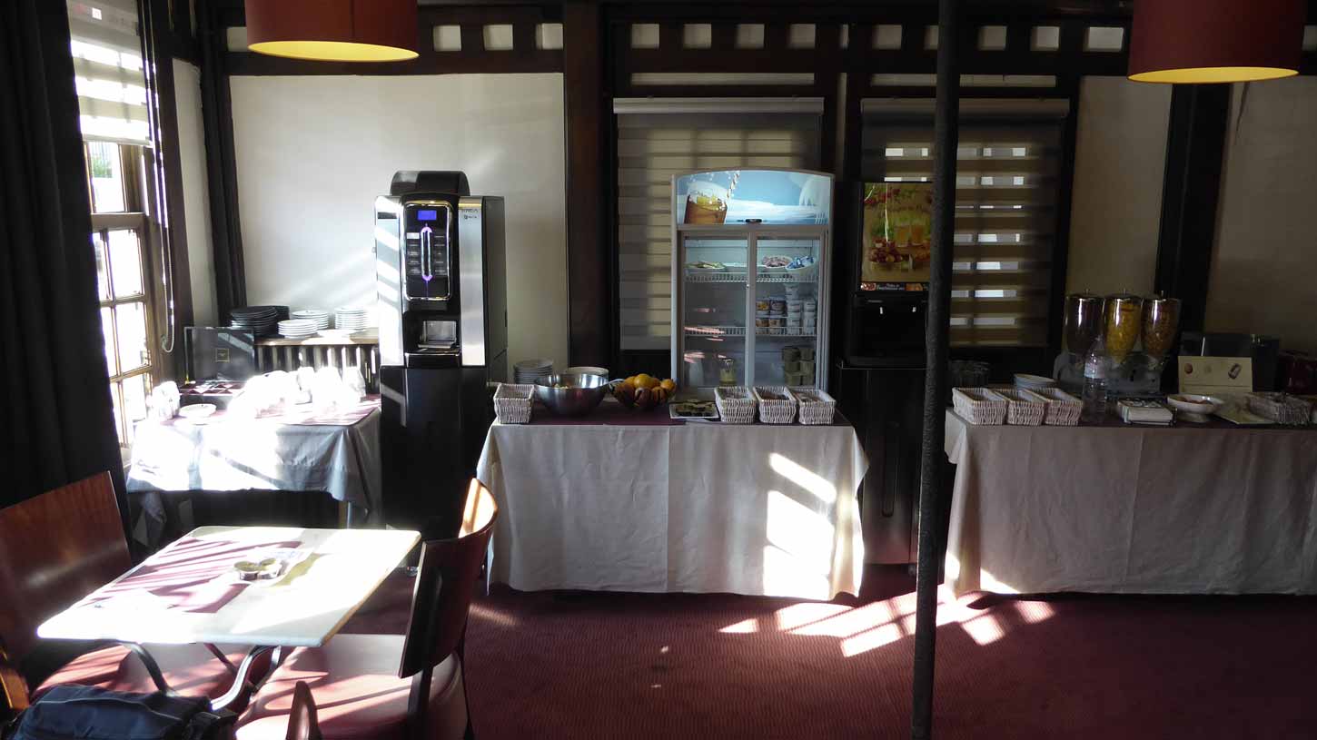 Gisterenavond goed gegeten in een restaurantje (063) om de hoek van het hotel. Vanmorgen, in het restaurant van het hotel (064) een goed ontbijtbuffet (065). Het was zwaar